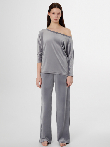 Домашняя пижама из велюра подарит вам ощущение уюта и мягкости. Этот уютный ансамбль состоит из джемпера полуприлегающего силуэта и свободных брюк, созданных для полного расслабления.
