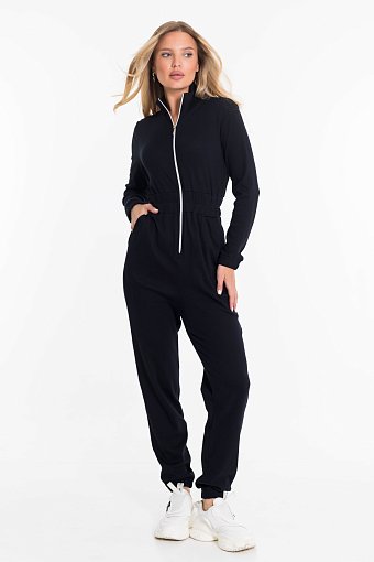 Женский комбинезон из однотонной рибаны с начёсом выполнен в лаконичном и удобном дизайне. Модель имеет застёжку-молнию спереди, воротник-стойку и длинные втачные рукава на резинке по низу. В области талии расположен широкий пояс на резинке, который обеспечивает комфортную посадку и подчёркивает силуэт. На передних половинках предусмотрены боковые карманы с притачной планкой. Низ брюк также собран на резинку, что делает изделие практичным и удобным для носки в прохладное время года.