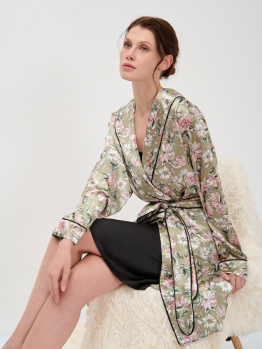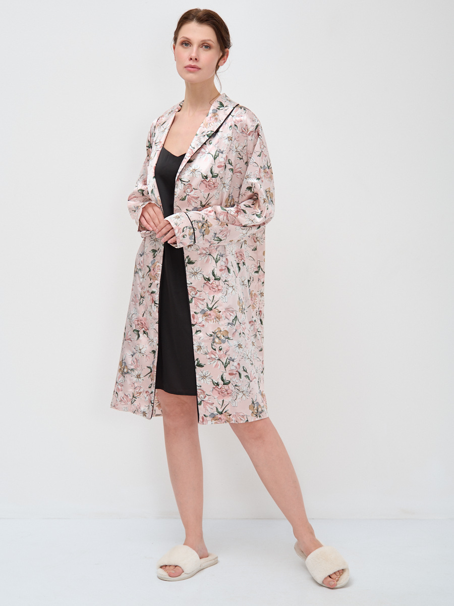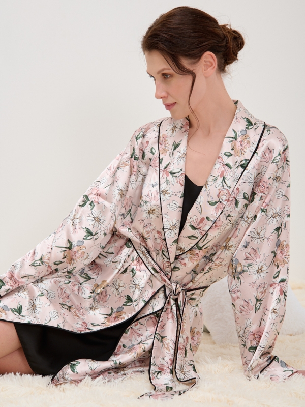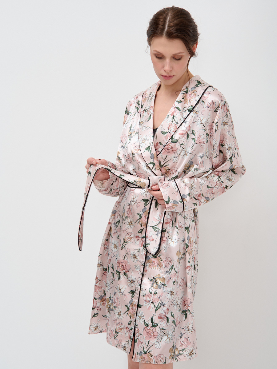 Представляем элегантный комплект для дома, созданный для тех, кто ценит безупречное качество и утонченный стиль даже в неформальной обстановке. Этот женский халат на запах и сорочка выполнены из премиальной ткани Армани-шелк, известной своей необычайной легкостью и мягкой, струящейся текстурой. Изделие дарит ощущение невесомости и комфорта, способствуя полному расслаблению после насыщенного дня.Мы, как российский производитель полного цикла, гарантируем высочайшее качество каждого элемента – от тщательно проработанных лекал до выбора эксклюзивных тканей. Халат с шалевым воротником, втачным длинным рукавом и съёмным поясом из основной ткани украшен изысканным декоративным контрастным кантом, что придает комплекту особую элегантность и завершенный вид. Актуальный принт с нежным цветочным узором на бледно-розовом фоне и стильный черный кант подчеркивают трендовость модели. Сорочка выполнена в классическом черном цвете, создавая гармоничный контраст.Включите этот комплект в ассортимент вашего бутика или шоурума, чтобы предложить клиентам не просто домашнюю одежду, а предмет роскоши, который подчеркивает их вкус и обеспечивает максимальный комфорт. Высокая оборачиваемость и маржинальность гарантированы благодаря идеальному балансу эстетики и практичности. Уход: машинная стирка при 30 градусах.