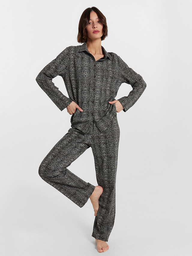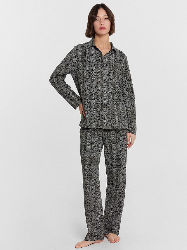 Почувствуйте истинный комфорт с женской пижамой от Mark Formelle. Рубашка свободного силуэта с центральной застежкой на пуговицы придаёт образу изысканность и непринужденность. А длинные рукава со спущенной линией плеча добавляют расслабленный и стильный вид. Брюки свободного кроя с эластичным поясом обеспечивают комфорт и свободу движений, создавая идеальную посадку на фигуре. Этот пижамный комплект выполнен из хлопковой кулирки, которая славится своей мягкостью и воздухопроницаемостью. Натуральный материал позволяет коже дышать, обеспечивая максимальный комфорт и уют в течение всей ночи. Эта стильная пижама станет вашим любимым выбором для ночного отдыха и комфортного сна, даря ощущение уюта и гармонии каждый день. Дарите себе и своим близким уютные подарки от Mark Formelle!