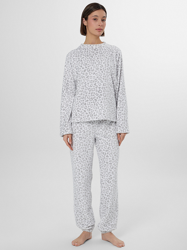 Белая домашняя пижама для женщин с леопардовым принтом подарит ощущение уюта. Нежный плюшевый материал невероятно мягкий и приятный к телу, а элегантный леопардовый узор на джемпере и брюках добавляет образу современный акцент.