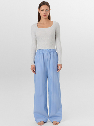 Свободный джемпер прямого кроя с круглой горловиной и длинными рукавами реглан обеспечивает полную свободу движений. Брюки со средней посадкой на мягком поясе с широкой резинкой удобно сидят по фигуре. Слегка зауженные к низу, они завершаются эластичной тесьмой для идеальной посадки, не стесняя движений во время сна или отдыха.