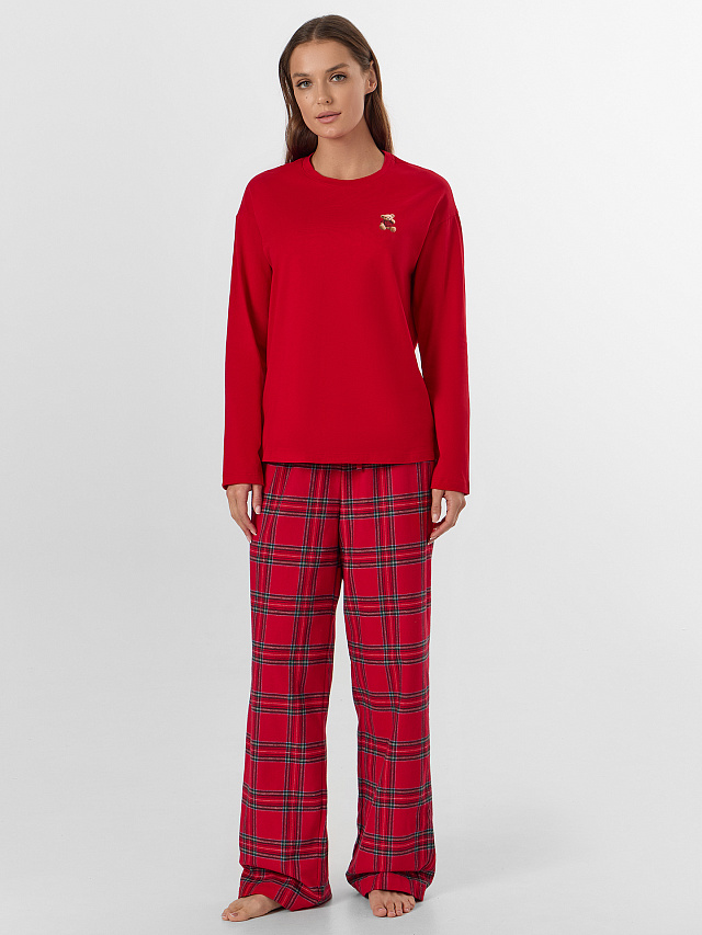 Пижама женская с очаровательным принтом маленького мишки создана для моментов уютного отдыха. Пижама состоит из джемпера прямого кроя и прямых брюк, полностью выполненных из натурального хлопка. Джемпер с круглой горловиной и длинными рукавами обеспечивает комфорт, а брюки с эластичным поясом на шнурке удобно сидят по фигуре, не стесняя движений.