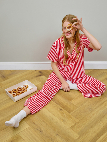 Пижама женская создана для тех, кто ценит комфорт и качество. Рубашка свободного кроя не обтягивает тело, позволяя коже дышать. Отложной воротник мягко обрамляет шею, а короткие рукава не мешают движениям во сне. Застежка на пуговицах удобна в использовании, а аккуратная строчка по низу предотвращает скручивание ткани.
