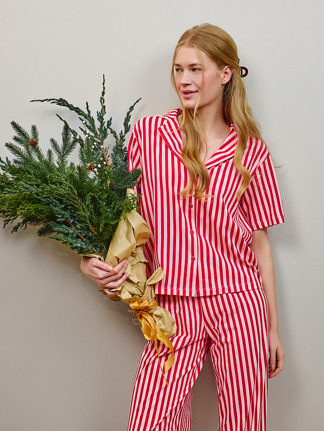 Оба предмета пижамы выполнены из натурального хлопка, который не вызывает раздражения и обеспечивает комфортную температуру тела ночью. Комплект подходит для ежедневного использования — ткань выдерживает стирки, не теряя мягкости и цвета.