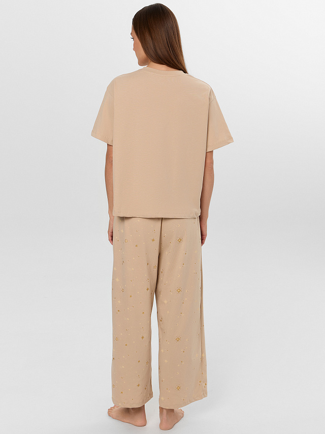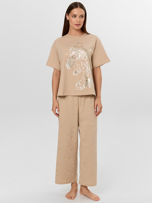Женская пижама бежевого оттенка из хлопка с милой надписью "Время сиять" создана для комфортного отдыха. Комплект включает джемпер прямого силуэта и свободные бриджи, выполненные из мягкого натурального хлопка, приятного к телу и обеспечивающего идеальную воздухопроницаемость. Джемпер с круглой горловиной и короткими рукавами удобно садится по фигуре, а свободный крой брюк с эластичным поясом на тесьме гарантирует полную свободу движений во время сна.