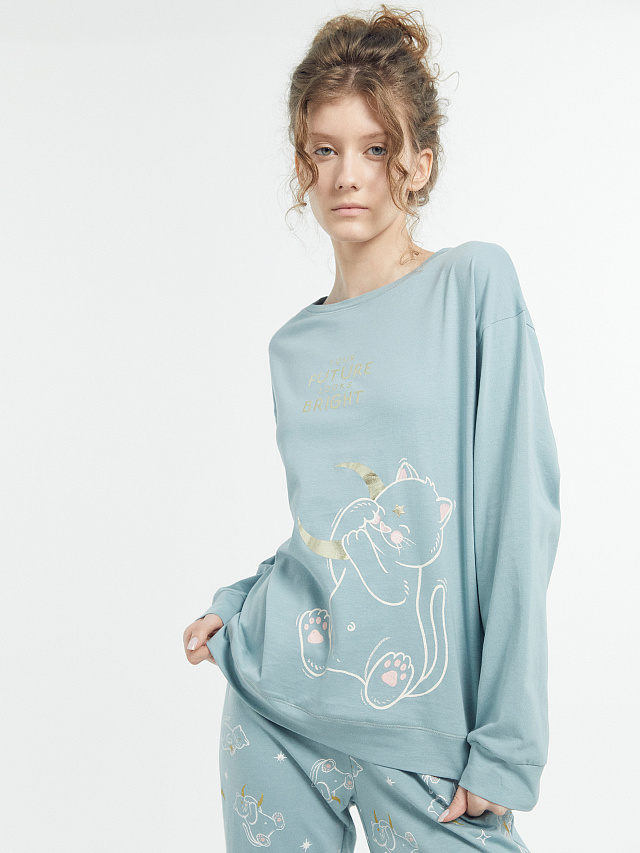 Комплект женский (джемпер, брюки) серый с принтом "котики со звездами"