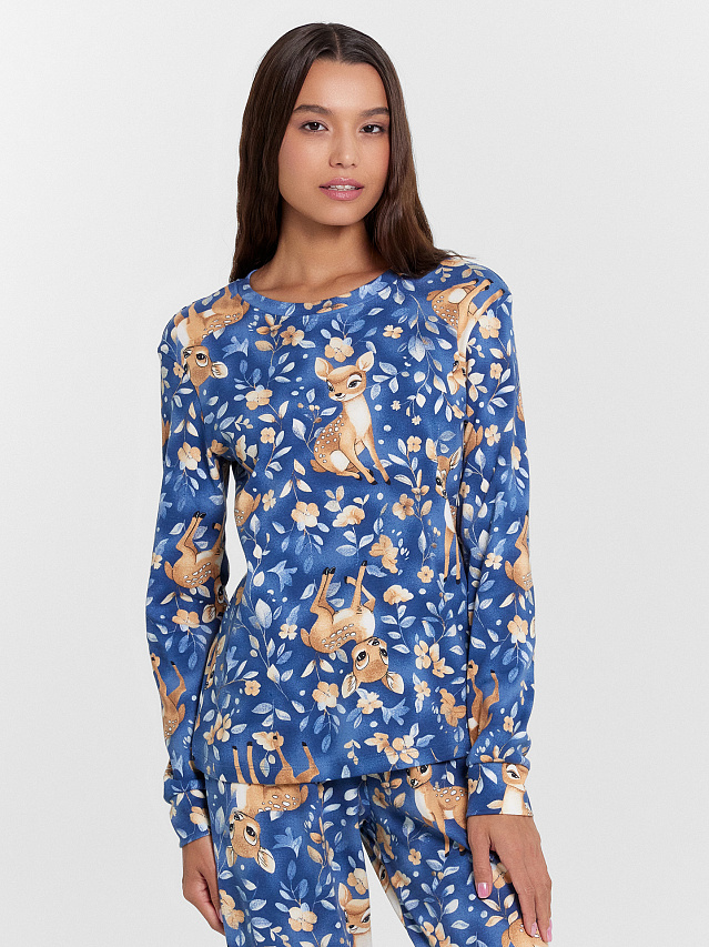 Комплект женский (джемпер, брюки) синий с оленятами