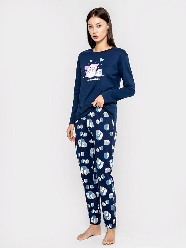 Комплект женский (джемпер, брюки) синий с принтом "пингвины"