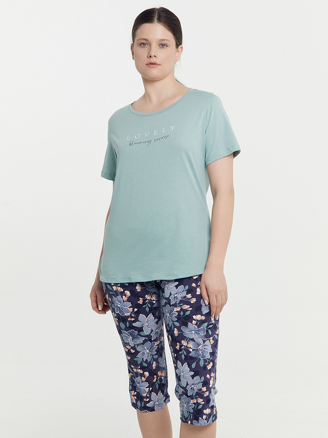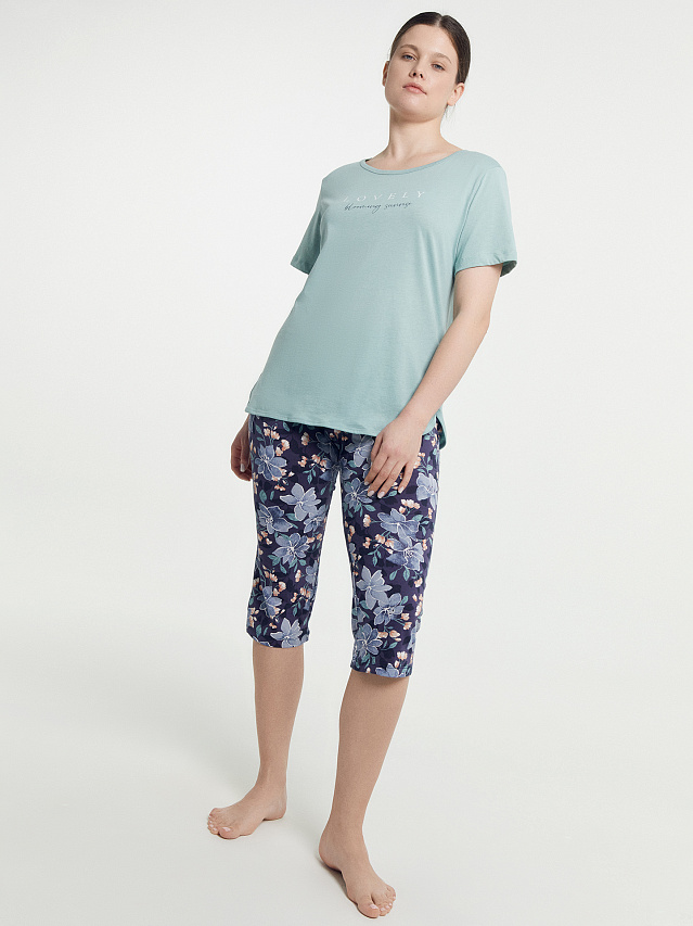 Комплект женский (джемпер, капри) зелено-синий с акварельными цветами