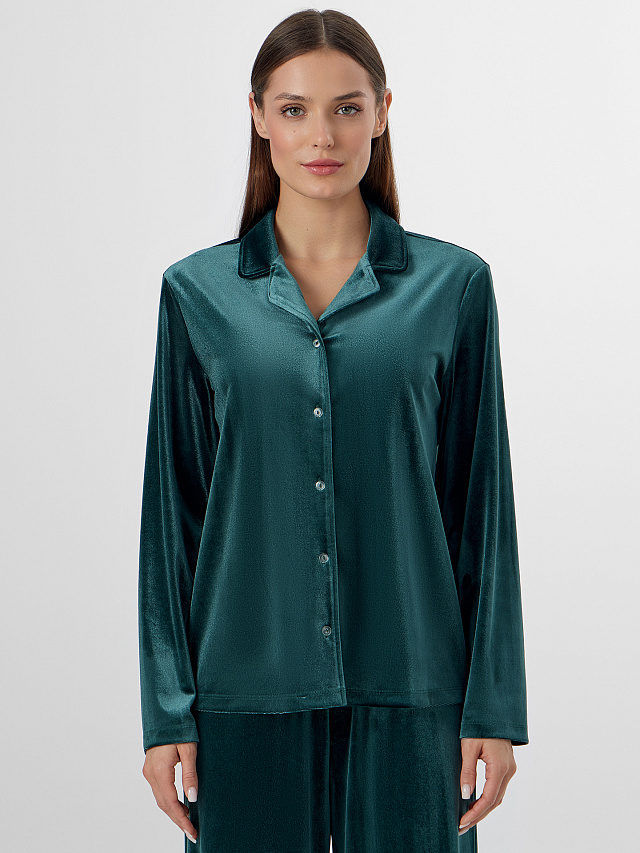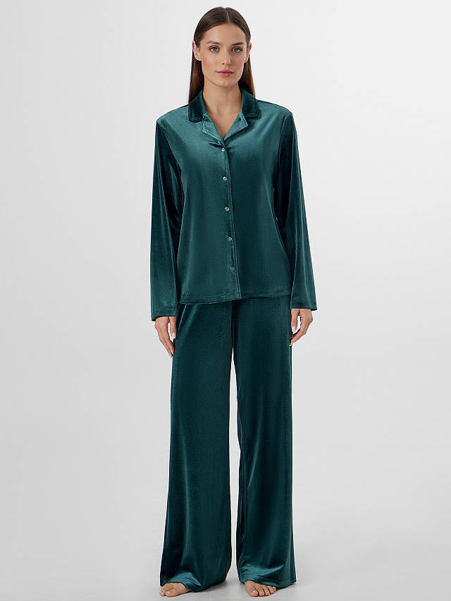 Зеленый велюровый домашний комплект создает образ уютной элегантности и расслабленного комфорта. Набор, состоящий из прямого жакета и свободных брюк, идеально подходит для отдыха дома и создания стильного домашнего образа.