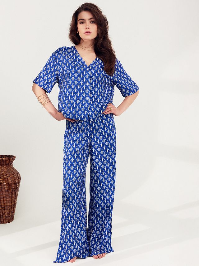 Представляем вашему вниманию комплект женский с брюками — идеальный вариант для комфортного и уютного сна, отдыха и домашних дел. Изготовленный из 100% вискозы, он обеспечивает мягкость, комфорт и позволяет коже дышать. Дизайн пижамы сочетает в себе простоту и элегантность — красивые цвета и оригинальный принт добавляют особую изюминку. Жакет с центральной застежкой на пуговицы. По боковым швам есть изящные разрезы. Брюки свободного силуэта с поясом на резинке гарантируют удобство. Широкий размерный ряд. Рекомендуем!