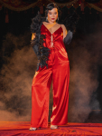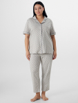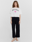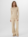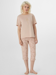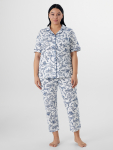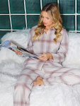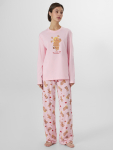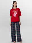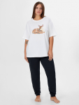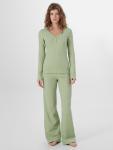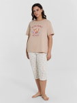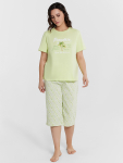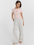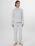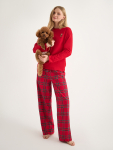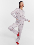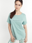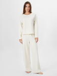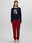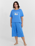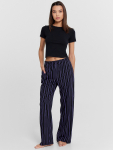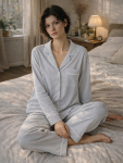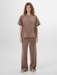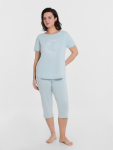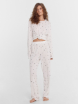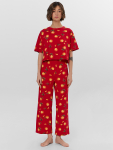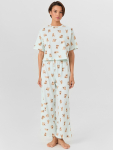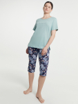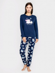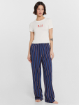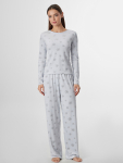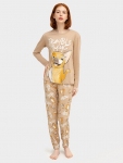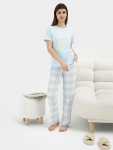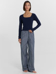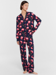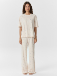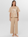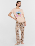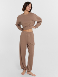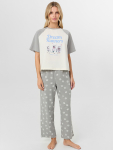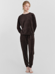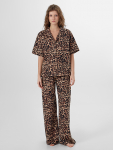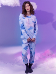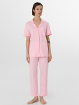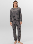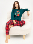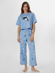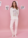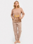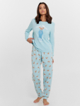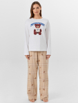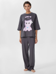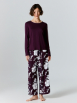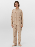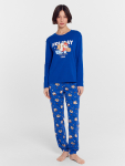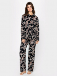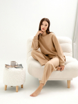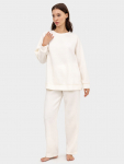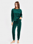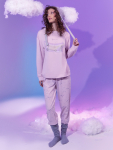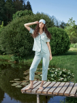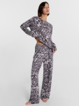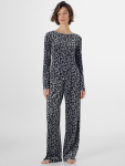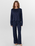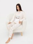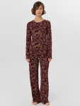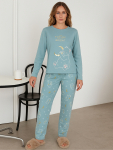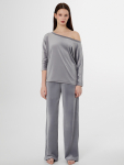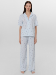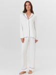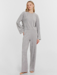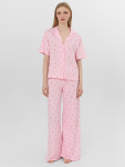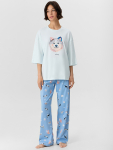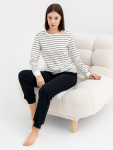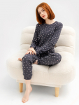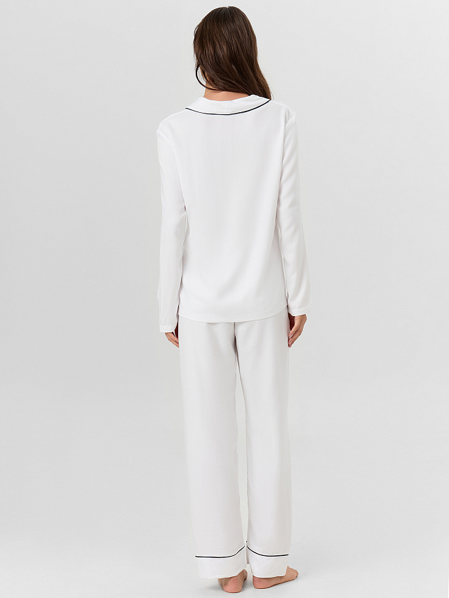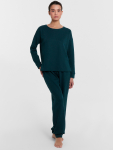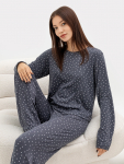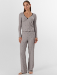 Пижамный комплект из жакета и брюк, выполненных из вискозного трикотажа. Жакет длиной до середины ягодиц, прямого силуэта, с V-образной горловиной, длинными рукавами на манжетах и немного спущенной линией плеча. По центру жакет застегивается на пуговицы. Брюки длинные, свободные, на манжетах и с эластичной резиной в поясе. Так выглядит комфорт!