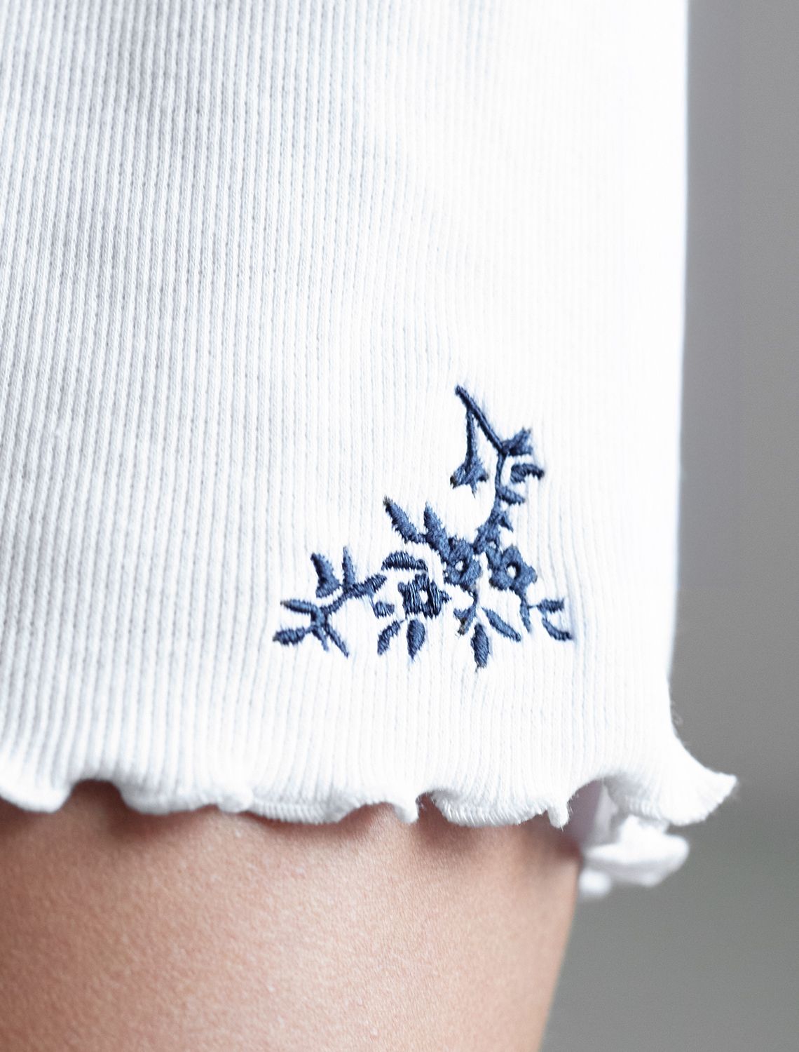 Трикотажные милые шорты белого цвета выполнены из трикотажа в мелкий рубчик. Особенность полотна - трикотаж кашкорсе удивительной мягкости, намного мягче стандартных вариантов, подходящий для расслабленных домашних и пижамных образов. Хлопок обеспечивает максимальный комфорт даже в течение длительного времени и позволяет коже дышать, а эластан в составе позволяет свободно двигаться и подстраивается под особенности фигуры. Красивые пижамные шорты выполнены с поясом на эластичной резинке — это обеспечивает комфортную посадку на любую фигуру, а так же на большие размеры. Контрастный принт в виде цветов делает шортики более привлекательными и особенными, добавляя легкости и игривого настроения. Небольшой рюш по краю шорт подчеркивает женственность обладательницы.