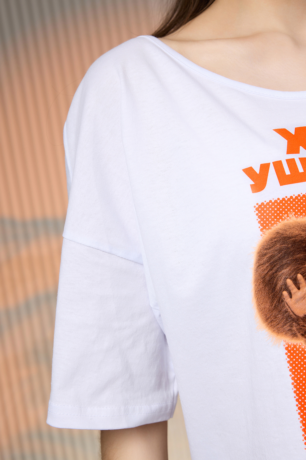 Костюм состоит из укороченной футболки "оверсайз" и шорт. Футболка с округлой горловиной. Рукав короткий. Горловина обработана бейкой из основного полотна. Шорты на резинке, со складками в верхней части передних половинок. Материал: кулирка; Состав: хлопок 100%.