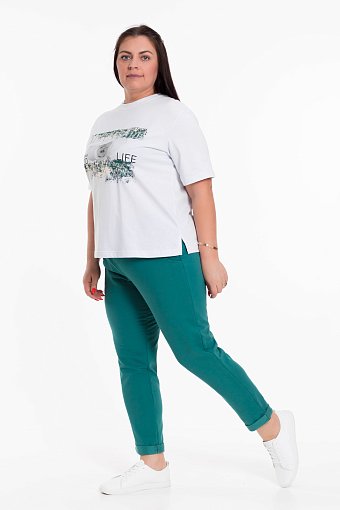 Футболка имеет спущенную линию плеча, что придаёт модели свободный и расслабленный вид. Рукав доходит до локтя, обеспечивая удобство и свободу движений. По бокам внизу расположены небольшие разрезы, а спереди — принт, который гармонирует с цветом брюк.