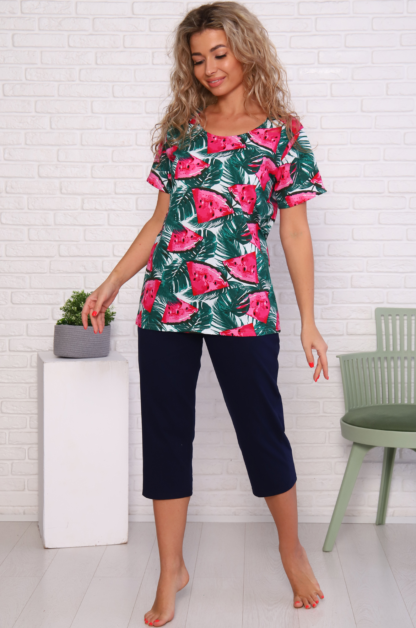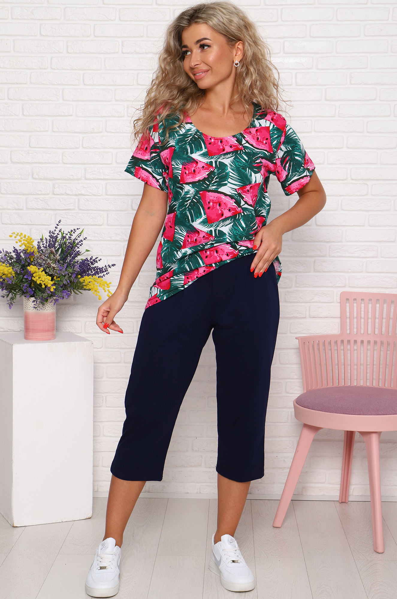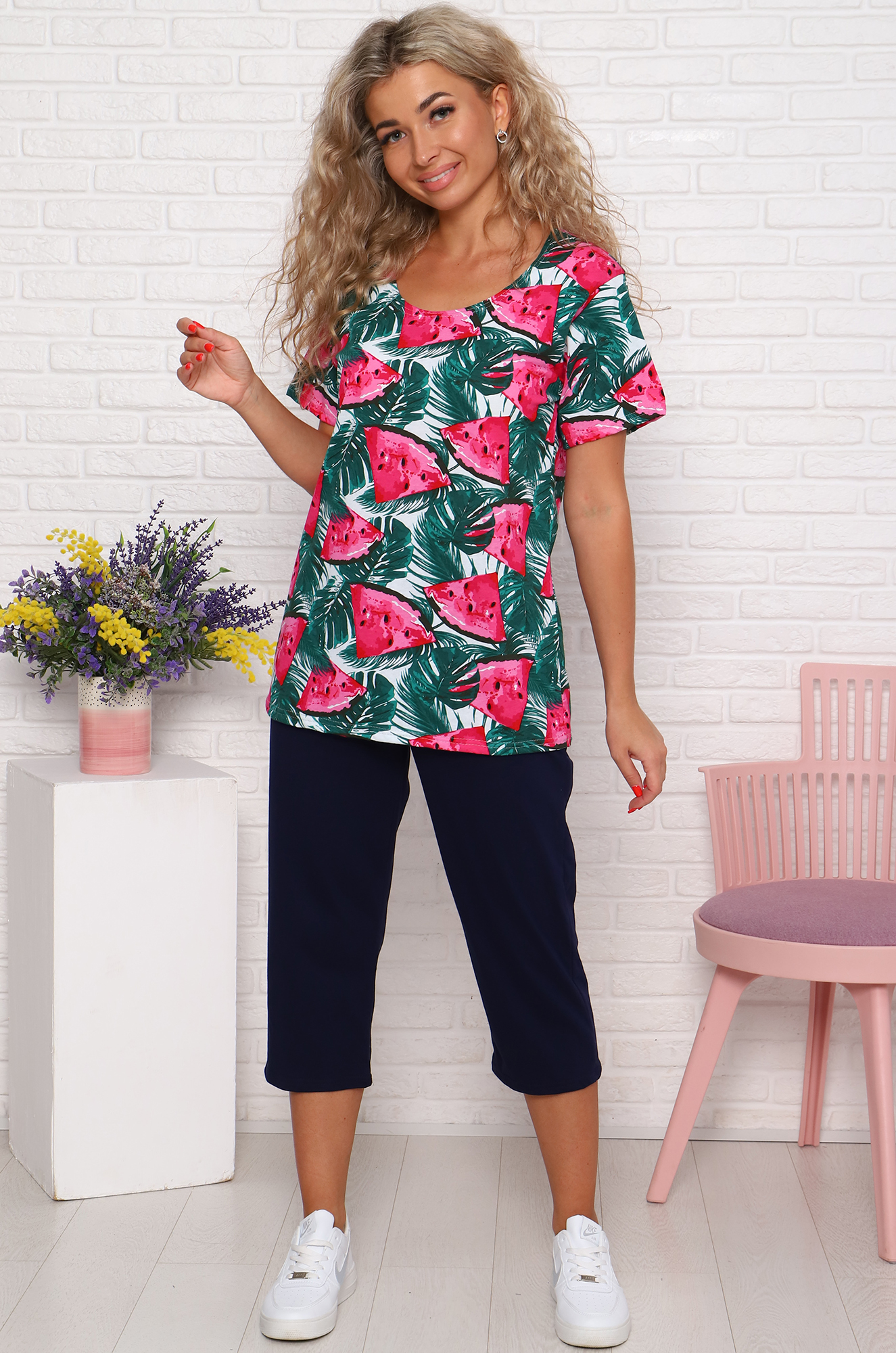Яркий, стильный и удобный хлопковый костюм для дома и отдыха. Футболка прямого кроя, рукав втачной. Бриджи свободные, пояс на резинке. Ткань кулирка.