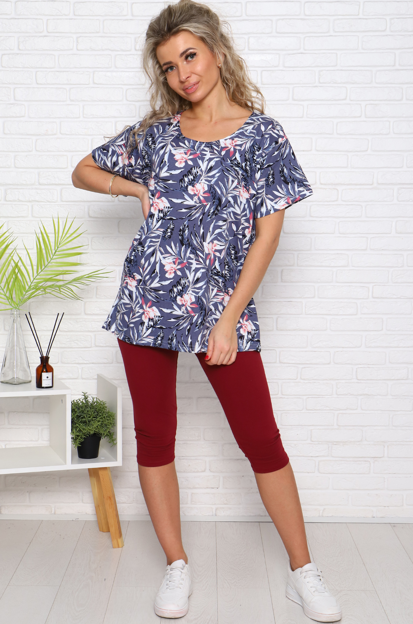 Удобный и невероятно женственный костюм для повседневного домашнего образа. Футболка прямого кроя комфортной длины, рукав втачной. Бриджи облегающие, с высокой посадкой, длина ниже колена, пояс на резинке. Прекрасный вариант для дома, дачи на отдых или для прогулки.
