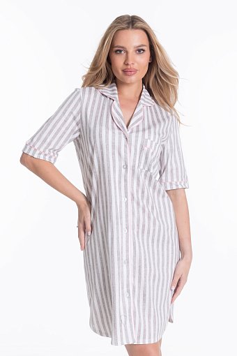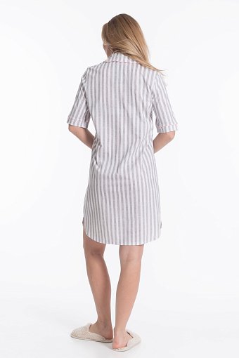 Халат выполнен из хлопкового полотна. С отложным воротником и застёжкой на пуговицы спереди. По бокам внизу небольшие разрезы. Слева расположен нагрудный карман, детали халата украшены кантом.