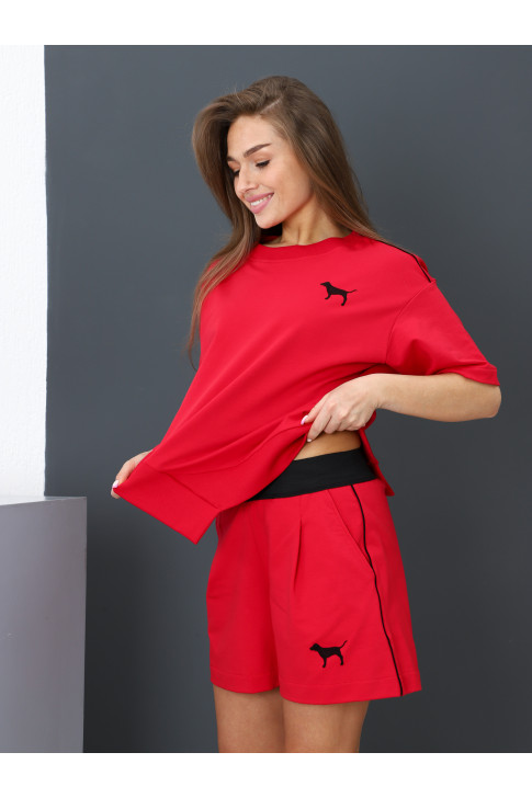 Стильный женский костюм с шортами. Выполнен из очень приятной и мягкой, но износостойкой и гипоаллергенной ткани (футер 2-х нитка). Асимметричная футболка с коротким втачным рукавом и принтом "Собака". Шорты с двумя карманами, пояс - широкая резинка.