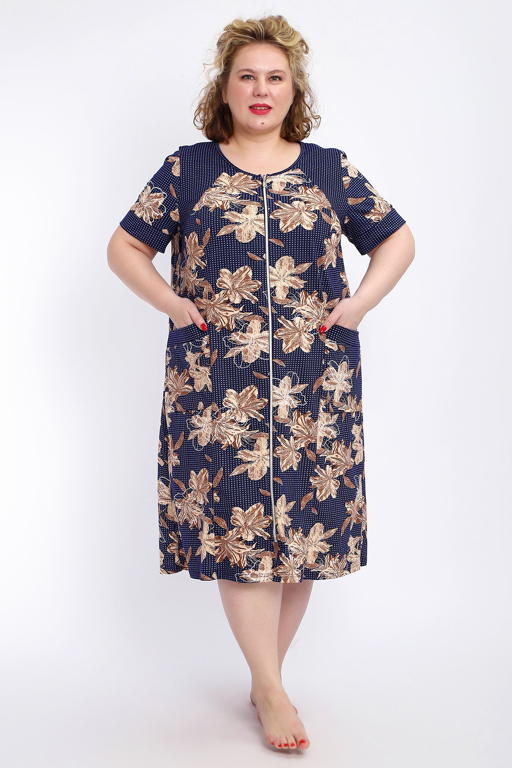 Ощутите домашний уют и комфорт - выбирайте халат женский домашний больших размеров из мягкой хлопковой ткани с очаровательным принтом. Халат на молнии является самой популярной моделью, обеспечивает удобство во время носки, не сковывает движений. Прямой свободный крой платья позволяет скрыть недостатки фигуры и ощущать легкость во время домашнего отдыха. Халат домашний дополнен накладными карманами и стильной круглой горловиной, которая оформлена декоративными планками. Длина платья универсальная, за колено. В наличии есть большие размеры, поэтому выбирайте такой халат в роддом. Изделие выглядит стильно и привлекательно за счет нежных светлых бутонов цветов на контрастном темном фоне. Женская домашняя одежда российского производства имеет идеальную посадку, не линяет, не дает усадку после стирки и долго сохраняет первоначальный внешний вид. Цвет: Розовый веер;лилии;Синий веер; Материал: кулирка;кулирка; Состав: 100 % хлопок.