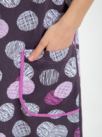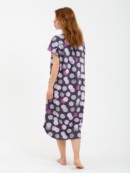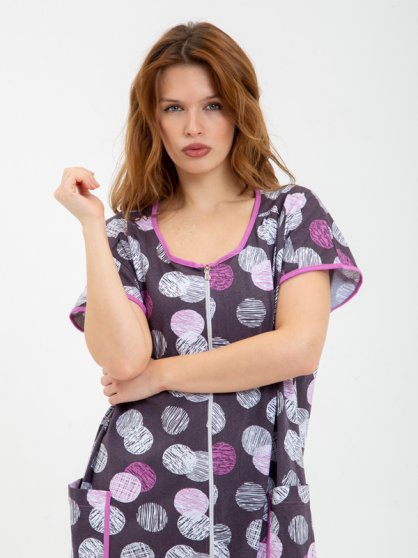 Оптовая продажа. Халат женский всесезонный, принт по всему полотну, из трикотажного хлопкового полотна, прямого кроя, свободного силуэта, с короткими втачными рукавами, U-образным вырезом горловины, центральной застежкой на молнию, накладными карманами. Горловина, рукава и карманы отделаны контрастной тесьмой. Модель предназначена для повседневной носки дома. Удобный свободный крой дарит комфорт и ощущение свободы движений. Одежда из хлопка комфортна и приятна для кожи, дышащая и легкая, длительное время не разрушается под влиянием воды.