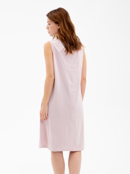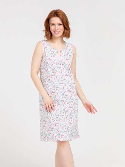 Оптовая продажа. Сорочка женская с принтом по всему полотну, из гладкокрашеного трикотажного полотна кулирная гладь, прямая, свободного кроя, длиной чуть ниже колена, без рукавов, без декоративных элементов, круглым вырезом горловины. Модель предназначена для повседневной носки дома. Удобный свободный крой дарит комфорт и ощущение свободы движений. Одежда из хлопка комфортна и приятна для кожи, дышащая и легкая, длительное время не разрушается под влиянием воды. Рекомендуется бережная стирка при 30С.