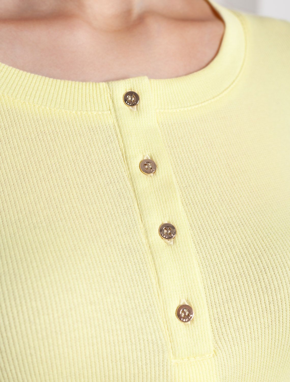 Лонгслив лимонного цвета в мелкий рубчик облегающий с круглым вырезом на пуговицах — это удобный и стильный выбор для любого времени года. Благодаря продуманному дизайну и аккуратному круглому вырезу такой вариант лонгслива отлично смотрится и на работе, и в повседневной жизни. Трикотаж в мелкий рубчик делает тонкий джемпер особенно мягким и дарит комфорт. Натуральный хлопок в составе приятен телу, обеспечивает хорошую воздухопроницаемость и сохраняет теплоту. Облегает фигуру, подчеркивая достоинства силуэта, делая образ женственным. Материал отличается мягкой и эластичной структурой, благодаря чему лонгслив не сковывает движений и дарит ощущение свободы в течение дня. Лонг подходит на любую фигуру, не теряя привлекательного внешнего вида даже на большие размеры. Такой стильный лонгслив позволяет легко создавать повседневные и расслабленные образы.