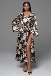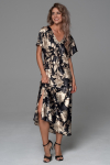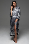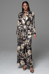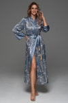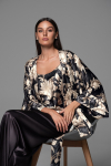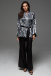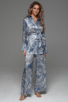 Брючный комплект Mia-Amore из принтованного смесового шелкового полотна, состоит из жакета с рукавами ¾ и брюк. Жакет на пуговицах, с накладным нагрудным карманом. Отложной воротник и фигурные широкие притачные манжеты украшены тонкими кантами в цвет рисунка. Брюки длинные, с карманами в боковых швах. Комплект дополнен поясом.