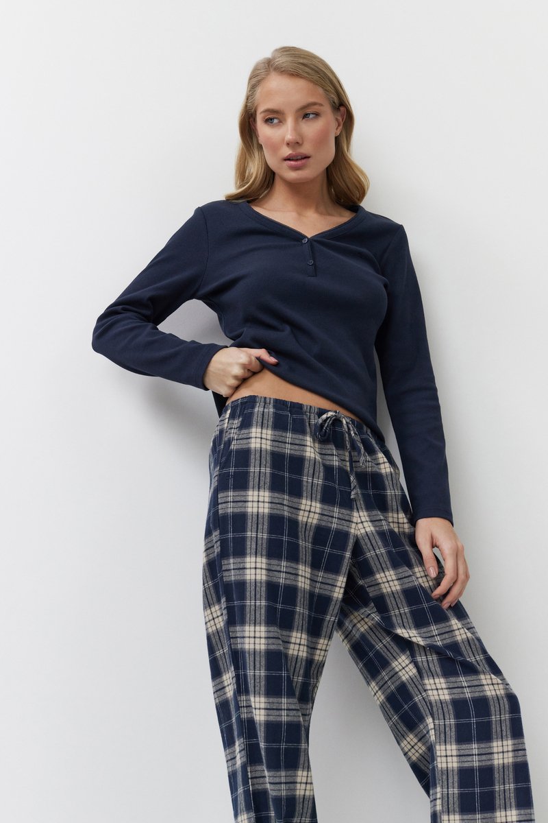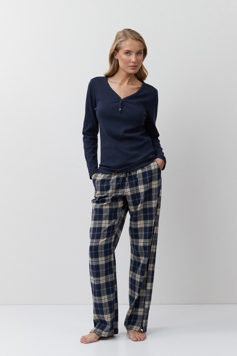 Пижама женская со штанами LUCIE для вашего ночного комфорта. Пижама выполнена из приятной к телу ткани. Лонгслив с длинными рукавами, вырез горловины с планкой на пуговицах. Штаны свободные, с эластичным поясом с завязкой и двумя боковыми карманами. Расслабьтесь с максимальным комфортом и стилем в пижаме LUCIE. Состав: верх 62% хлопок, 33% полиэстер, 5% эластан; низ 100% хлопок. 62% хлопок/ 33% полиэстер/ 5% эластан