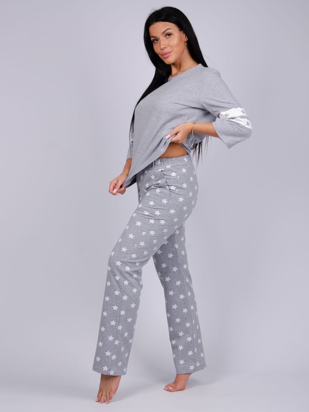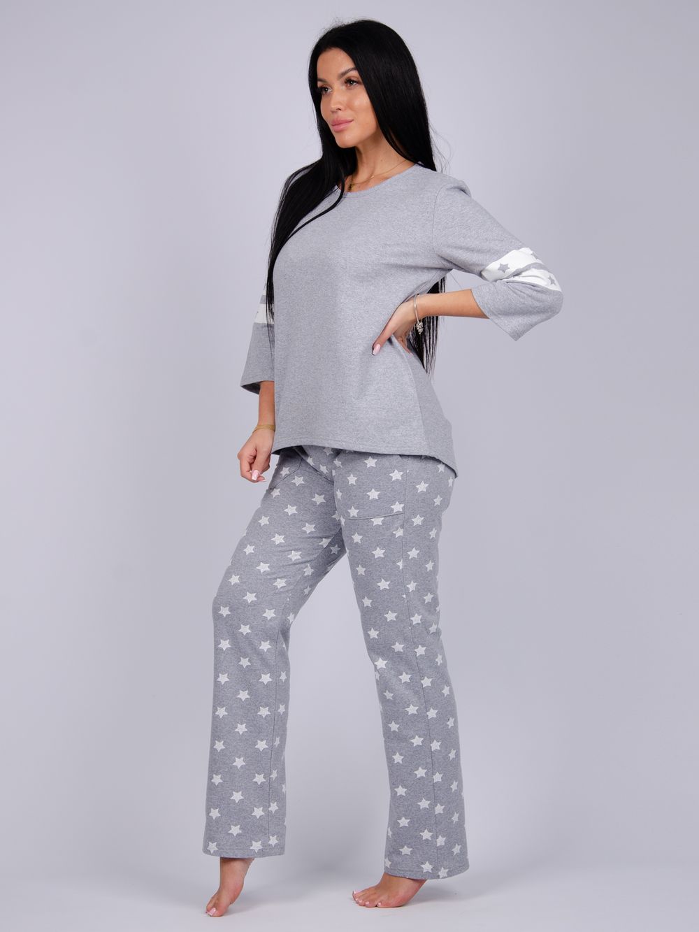 Пижама имеет теплый дизайн, что делает её отличным решением на прохладное время года. Благодаря свободному крою и легким материалам, вы сможете свободно двигаться, не ощущая никакого дискомфорта. Эта пижама особенно порадует тех, кто предпочитает модели больших размеров, создавая гармоничный и стильный образ на каждую ночь. Цвет: серый; Материал: футер 2-х нитка с начесом;футер 2-х нитка с начесом; Состав: 100% хлопок.