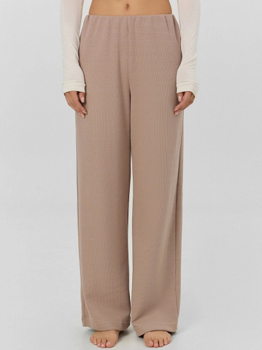 Брюки прямого силуэта, немного заужены к низу. Пояс цельнокроеный с резиной внутри 30RV. По центру пояса пробиты петли, протянута хб тесма 10мм. Низ брюк обработан в подгибку.