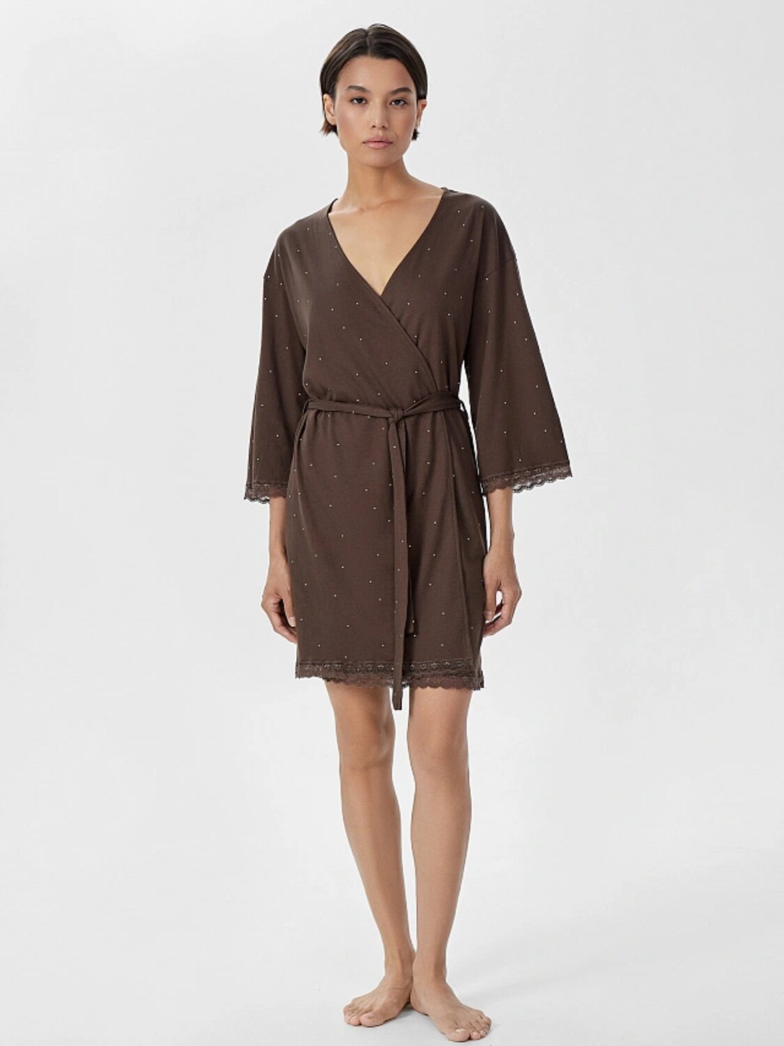 Женский халат прямого силуэта — это элегантная и удобная модель, созданная для домашнего уюта и расслабленного отдыха. Длина до колен делает его практичным и универсальным, подходящим как для утренних ритуалов, так и для вечернего расслабления. Халат выполнен с запахом, что позволяет регулировать посадку по фигуре, а съёмный пояс, продетый в шлевки по бокам, обеспечивает надежную фиксацию и подчеркивает талию. Дополнительные завязки на уровне талии помогают зафиксировать халат изнутри, делая посадку более стабильной и комфортной. Концы пояса свободно завязываются, позволяя регулировать степень прилегания. Длинные рукава создают ощущение уюта и тепла, особенно в прохладное время. Изделие выполнено из мягкого, приятного к телу материала — смеси модала и хлопка, которая отличается высокой воздухопроницаемостью, нежностью и устойчивостью к износу. Такой халат станет любимым элементом домашнего гардероба, сочетая в себе комфорт, функциональность и женственность.