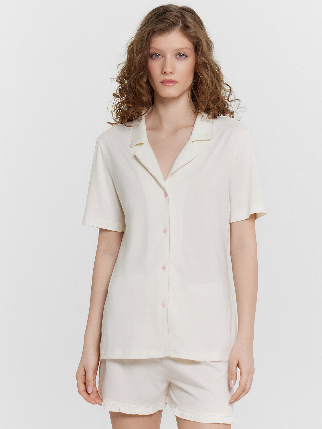 Эта женская пижама свободного силуэта — воплощение элегантности и комфорта, созданное для повседневного уюта. Изготовленная из высококачественного хлопка, она дарит приятные тактильные ощущения, легкость и воздухопроницаемость, обеспечивая максимальный комфорт как днем, так и ночью. Материал не только мягкий и натуральный, но и слегка тянущийся, что позволяет пижаме прекрасно сидеть на фигуре, не сковывая движений. Верх комплекта представляет собой рубашку с отложным воротником и лацканами, украшенными атласным кантом, что добавляет изделию утонченности и изысканного шарма. Короткие рукава делают модель подходящей для теплого времени года, а центральная застежка на пуговицах сочетает функциональность и стиль. Шорты, дополняющие комплект, выполнены в свободном силуэте и декорированы очаровательными рюшами по низу. Этот элемент вносит женственность и легкий акцент игривости в образ. Практичный, но стильный дизайн позволяет использовать эту пижаму не только для сна, но и для домашних дел, сохраняя уют и красоту в любом моменте. Модель идеально подходит для весны и лета, предлагая функциональность и изящество в одном изделии. Рекомендуем для создания гармоничного домашнего гардероба!