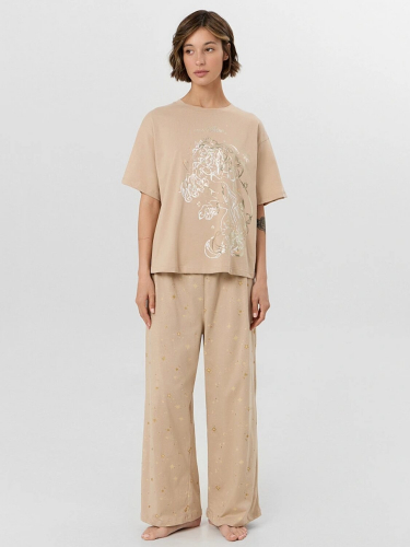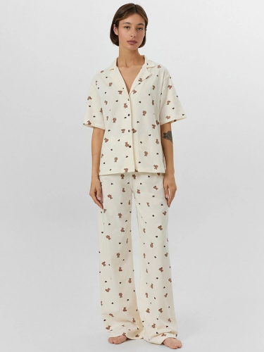 Женский домашний комплект, состоящий из рубашки и брюк, выполнен из натурального хлопка, что делает его особенно мягким, дышащим и комфортным для ежедневного ношения. Рубашка свободного силуэта с отложным воротником создает расслабленный, но аккуратный образ. Короткий рукав с немного спущенной линией плеча подчеркивает непринужденность, а обработка вподгибку придает изделию аккуратный финиш. Центральная застежка на пуговицах с петлями делает рубашку удобной и функциональной, а низ, также обработанный швом вподгибку, завершает ее лаконичный силуэт. Брюки свободного кроя с посадкой на талии обеспечивают максимальный комфорт. Эластичный пояс на кулиске позволяет регулировать посадку, а низ, застроченный швом в подгибку, сохраняет форму и аккуратность. Этот комплект идеально подойдет для домашнего отдыха, сна или уютных вечеров, сочетая в себе практичность, стиль и заботу о коже.