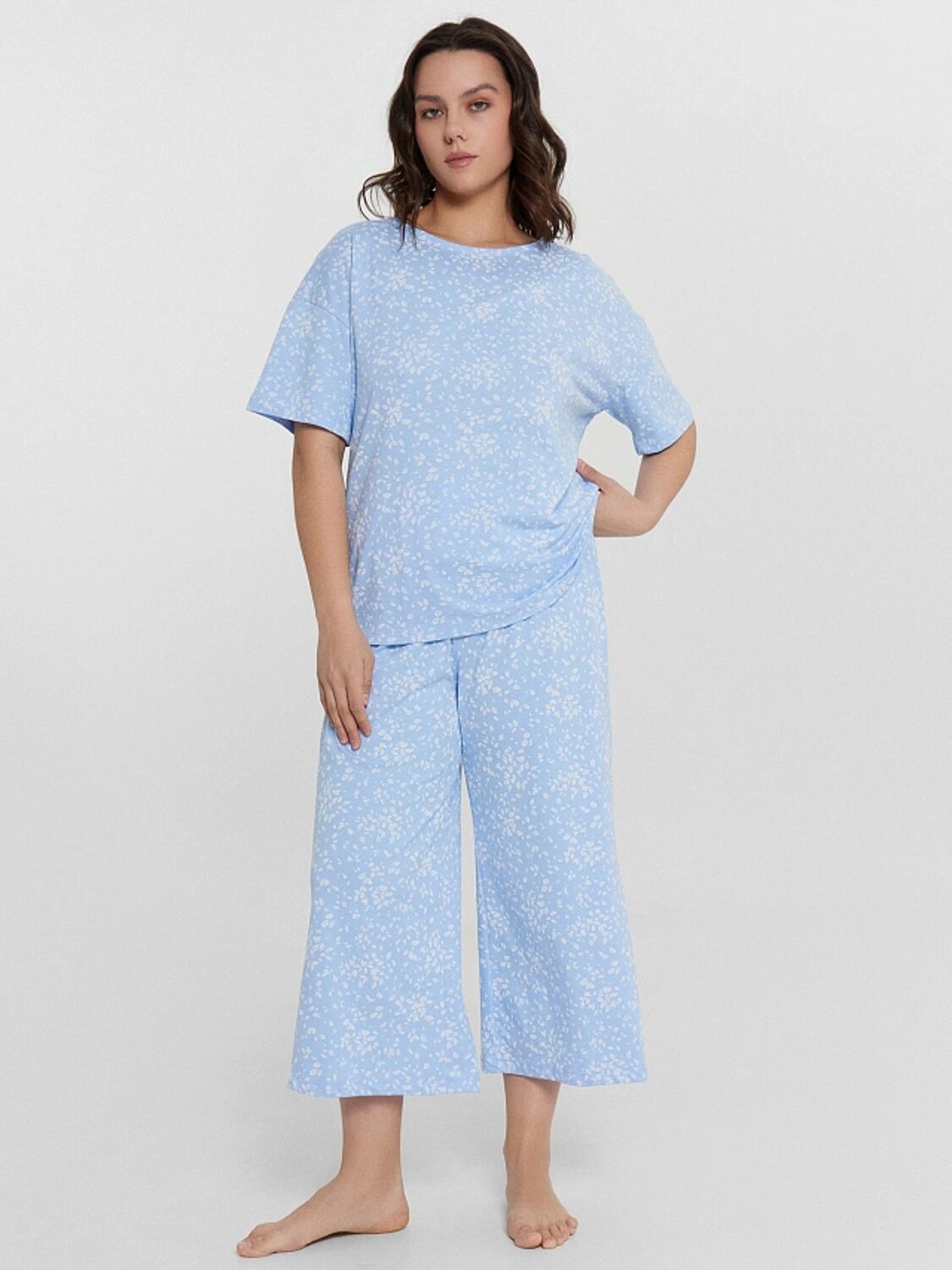 Женская пижама Mark Formelle станет идеальным дополнением вашего домашнего гардероба. Свободная футболка с круглой горловиной и короткими рукавами со спущенной линией плеча обеспечивает максимальный комфорт и свободу движений. Бриджи свободного кроя с эластичным поясом идеально сидят на талии, не стесняя движений и обеспечивая удобство на протяжении всего дня. Изделие выполнено из нежной кулирки - мягкого и приятного к телу материала, который отличается дышащими свойствами и гипоаллергенностью. Подарите себе или своим близким эту чудесную пижаму и наслаждайтесь уютными домашними вечерами.