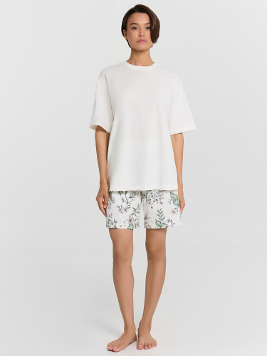 Женский домашний комплект — идеальное сочетание комфорта, свободы движений и стильного расслабленного образа! Футболка свободного силуэта обеспечивает легкость и удобство, позволяя наслаждаться непринужденной посадкой. Круглая горловина создает универсальный классический акцент, а короткие рукава со спущенной линией плеча добавляют мягкости силуэту. Низ рукавов и джемпера обработан швом вподгибку, что делает изделие аккуратным и долговечным. Шорты свободного силуэта подчеркивают непринужденный стиль, а укороченная длина делает модель легкой и удобной для отдыха. Эластичный пояс обеспечивает комфортную посадку, а декоративный гульфик с пуговицами добавляет интересный стильный акцент. Низ шорт обработан швом вподгибку, что придает аккуратный вид. Изготовленный из натурального хлопка, комплект остается мягким, воздухопроницаемым и приятным к телу. Идеальный выбор для расслабленного домашнего отдыха!