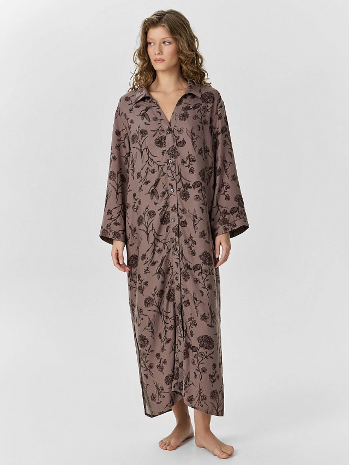 Женское домашнее платье прямого силуэта — это идеальное сочетание комфорта и сдержанной элегантности. V-образная горловина с отложным воротником придает образу мягкий акцент, делая его чуть более собранным, даже в рамках повседневной домашней одежды. Центральная застежка на пуговицах делает модель не только практичной, но и визуально структурированной, а укороченные рукава с манжетами добавляют завершенности и легкого ретро-оттенка. Длина ниже колена и разрезы в боковых швах обеспечивают свободу движений и подчеркивают удобство посадки, при этом визуально вытягивая силуэт. Обработка низа платья швом в подгибку сохраняет форму и эстетичный вид после множества стирок. Вискозная ткань приятно струится по телу, дарит ощущение мягкости и прохлады — именно то, что хочется чувствовать дома.