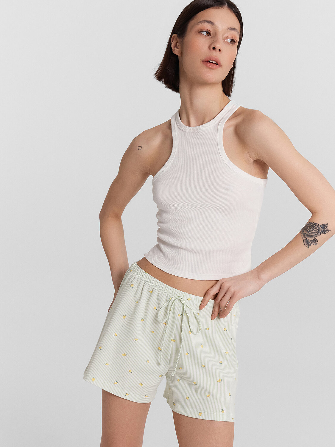 Хлопковые шорты из кулирного полотна. Силуэт прямой, длина мини. Пояс с эластичной тесьмой и имитацией завязки. Уютные шортики!