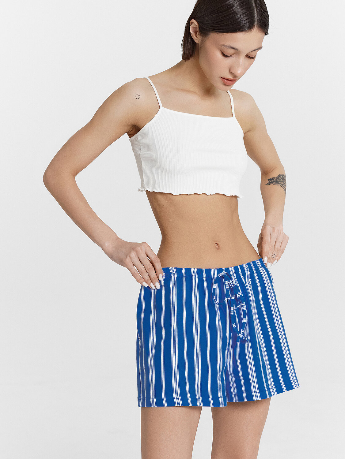 Хлопковые шорты из кулирного полотна. Силуэт прямой, длина мини. Пояс с эластичной тесьмой и имитацией завязки. Уютные шортики!