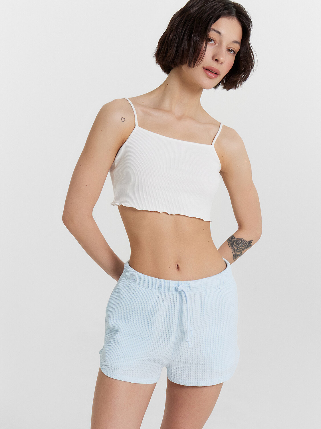 Домашние женские шорты — идеальное сочетание комфорта и легкости! Модель свободного кроя длины мини обеспечивает полную свободу движений, делая ее подходящей для отдыха дома или летних дней. Эластичная талия на кулиске гарантирует удобную посадку, а боковые карманы добавляют практичности, позволяя держать под рукой мелкие предметы. Шорты выполнены из натурального хлопкового материала с вафельной фактурой, который отличается своей мягкостью, воздухопроницаемостью и стильным внешним видом. Низ аккуратно обработан швом в подгибку, что обеспечивает чистую и долговечную отделку. Эта модель станет вашим любимым выбором для создания непринужденного и уютного образа!