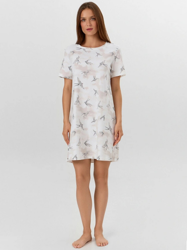 Ночная сорочка с нежным цветочным узором отличается продуманным кроем. Спущенное плечо и короткий рукав обеспечивают удобную посадку, а круглая горловина классической формы подчеркивает женственность. Длина выше колен идеальна для свободного движения.