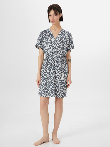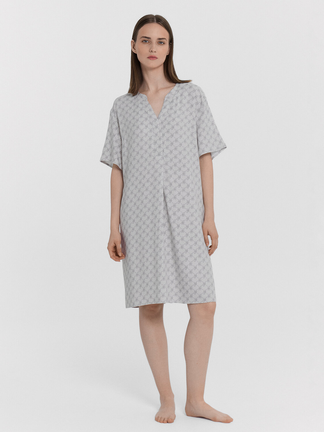 Туника женская прямого силуэта. Разрез переда обработан притачными планками с закрепкой. Горловина круглой формы, с притачной стойкой. Рукава короткие. Нижние срезы застрочены в подгибку . Низ туники обработан швом вподгибку.