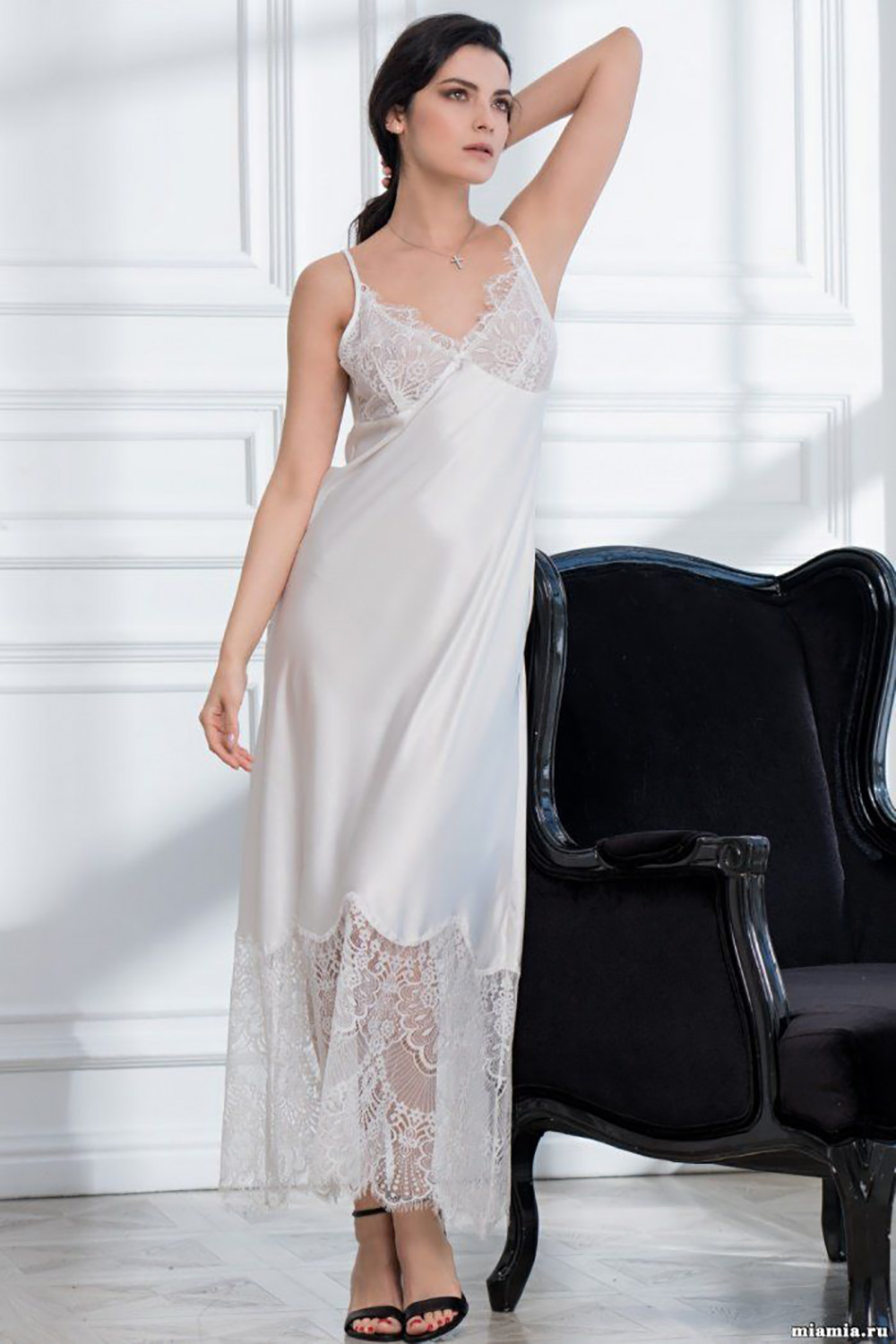 Длинная сорочка Mia-Amore на тонких бретелях из искусственного шелка в сочетании с нежнейшим кружевом. Отрезные кружевные чашки с подкладкой из тонкой сетки: в белом цвете – в тон изделия, в черном – бежевая, для соблазнительного эффекта голого тела. Низ сорочки украшен широкой кружевной вставкой, кромка основного полотна изящно повторяет форму кружева, что еще больше подчеркивает элегантность и изысканность этой модели.
