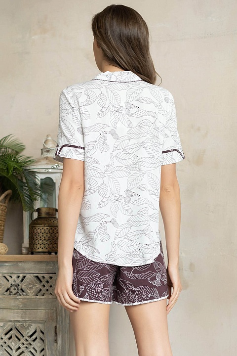 Комплект Mia-Amore состоит из рубашки с короткими рукавами, центральной застежкой на пуговицы и шорт. Комплект выполнен из принтованной вискозы. Светлый жакет украшен тёмным кантиком, темные шорты выполнены с отделкой из светлого кантика.