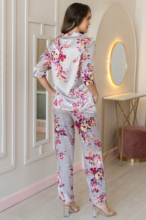 Комплект Mia-Amore состоит из блузы и брюк, выполнены принтованной смесовой ткани. Блуза на пуговицах с рукавом длиной 3/4. По бокам брюк расположены карманы, а по низу - разрезы.