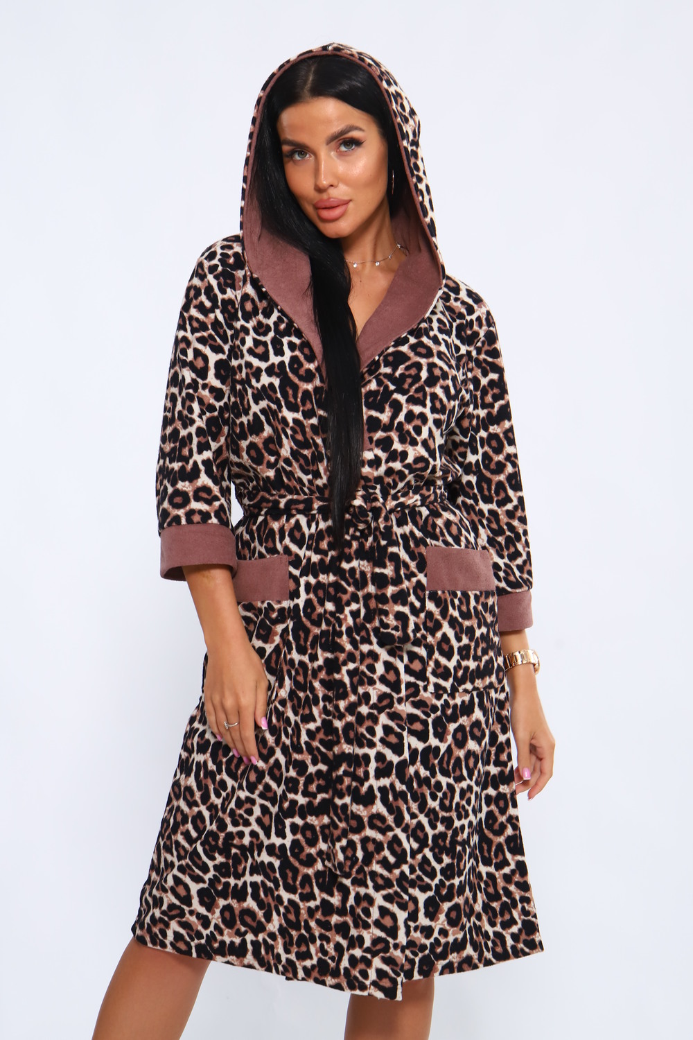 Халат женский из махры в приятном цвете. Халат с капюшоном и карманами. Халат на запах с поясом. Выполнен с тканью компаньон. Комфортный, средней длины. Цвет: леопард; Материал: махра;махра; Состав: 80% хлопок, 20% пэ.
