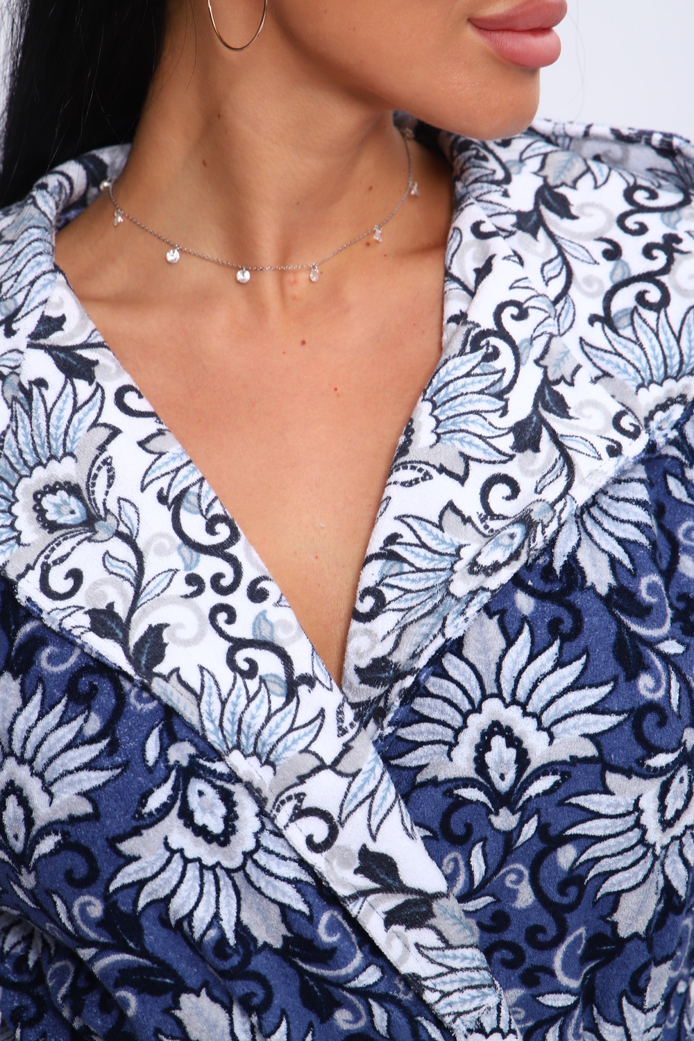 Халат женский из махры в приятном цвете. Халат с капюшоном и карманами. Халат на запах с поясом. Выполнен с тканью компаньон. Комфортный, средней длины. Цвет: синий+цветы; Материал: махра; Состав: 80% хлопок, 20% пэ.