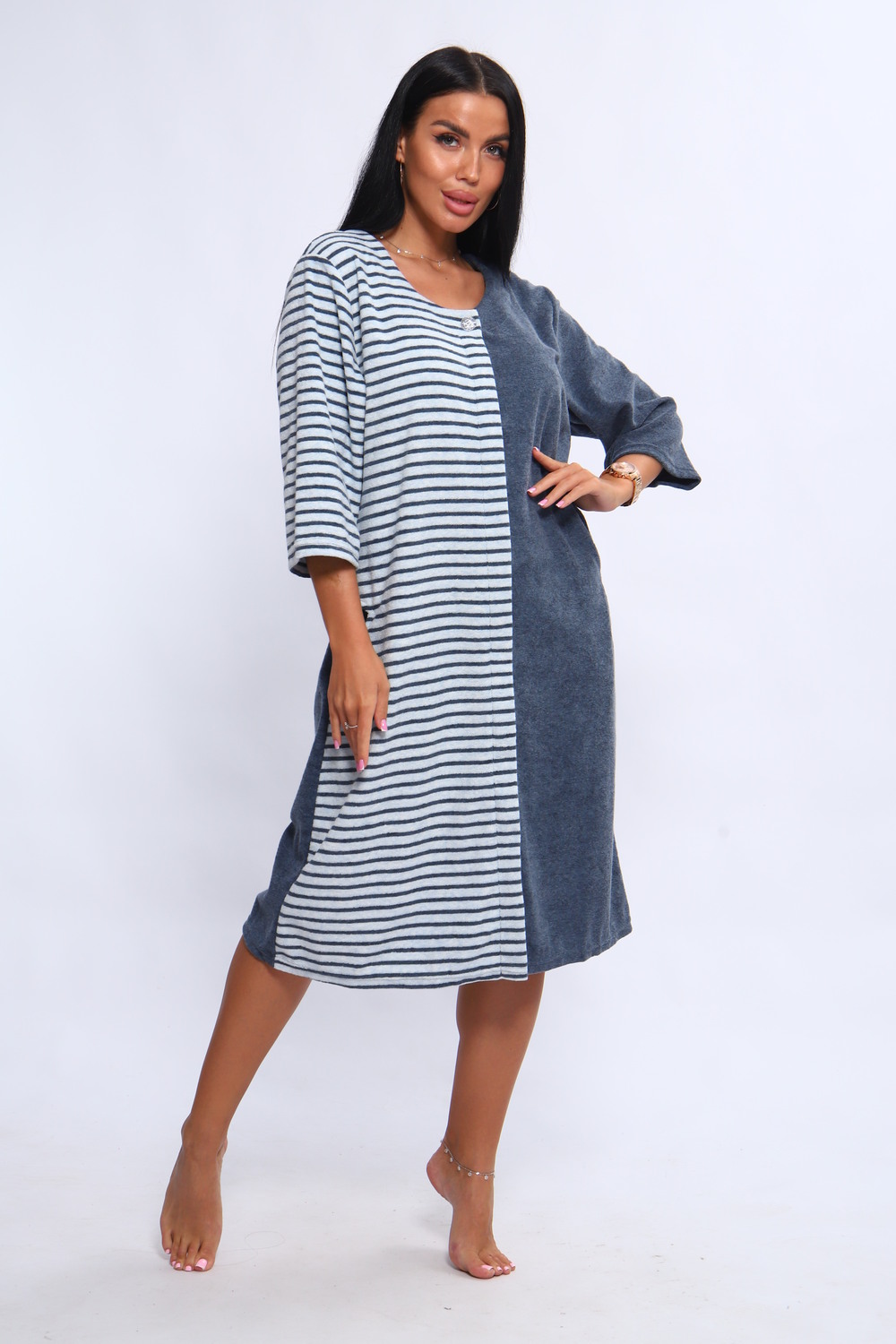 Халат женский махровый на молнии. Халат ткань состав 80% хлопок, 20% пэ, расцветка тренд сезона и года. Халат с двумя карманами, молния закрытая планкой на пуговице. Рукав 3/4, средняя длина.