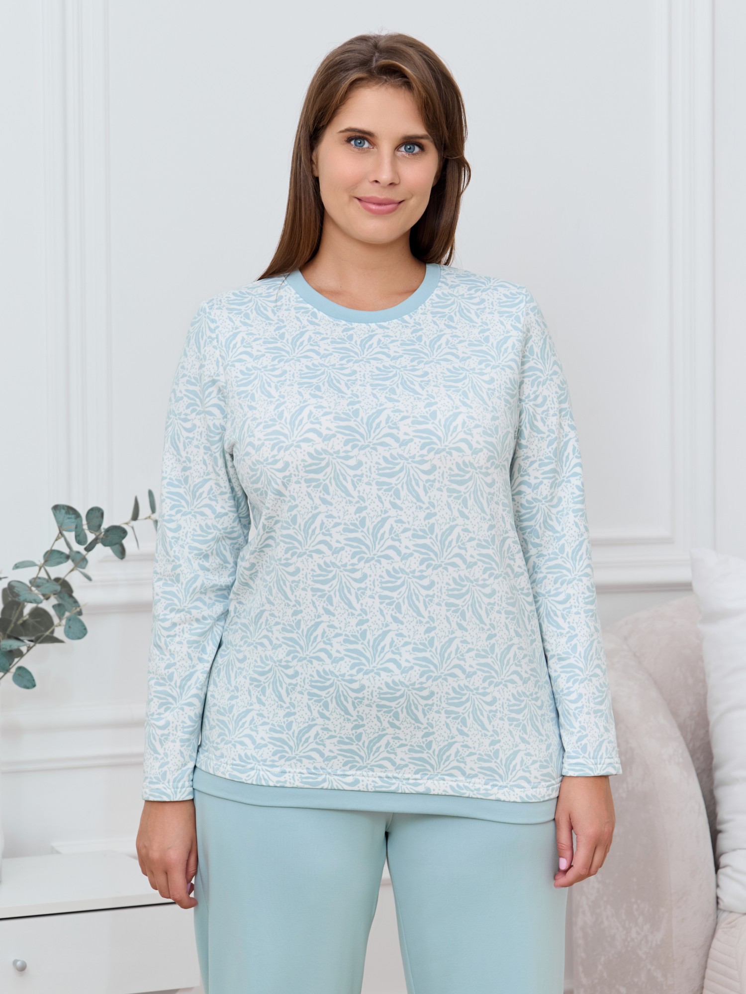 Пижама женская из трикотажного полотна «микрофлис» в комбинации двух видов:с набивным рисунком и гладкокрашеного в единой цветовой гамме, состоящая из футболки и брюк. Футболка - из полотна с набивным рисунком, классического покроя, с длинными втачными рукавами, горловиной овальной формы, обработанной втачной планкой. Низ изделия, горловина обработаны притачными планками из контрастного материала.Брюки – свободного покроя, с эластичной тесьмой по талии и нижним срезам.